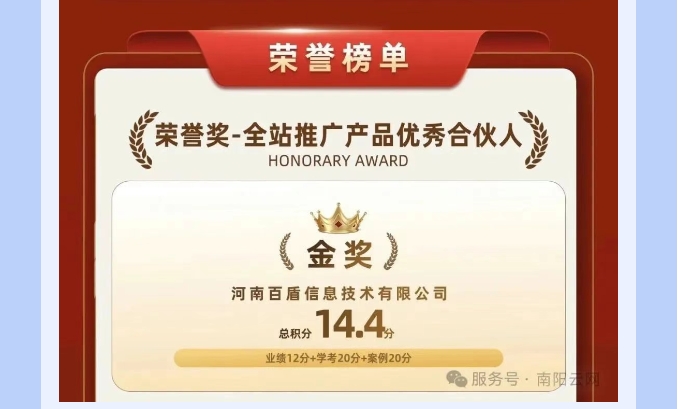值得關注的是,河南百盾近期還斬獲了"全站推廣產(chǎn)品優(yōu)秀合伙人金獎"。